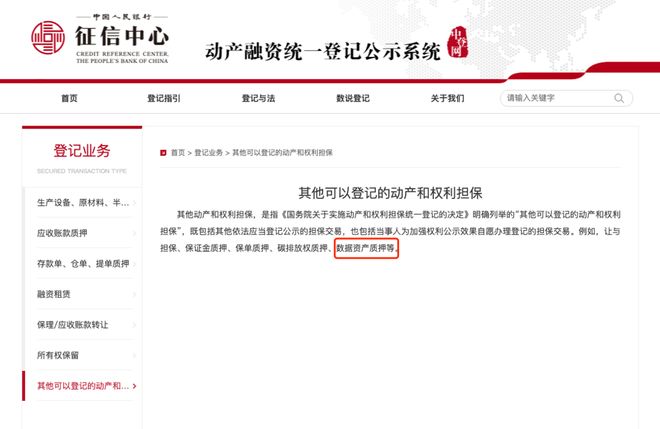 中国人民银行征信中心动产融资统一登记公示系统显示,在登记业务第七条:其他可以登记的动产和权利担保中举例提到了“数据资产质押”。这意味着数据资产已经成为了可登记的动产之一。