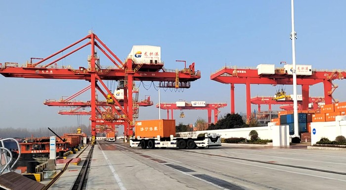 京杭运河畔,济宁港航龙拱港有限公司的码头上一派繁忙景象,却鲜见人影。16台无人集卡穿梭自如,依托“5G+AI+数字孪生”技术,实现厘米级高精定位与高效作业。这里不仅是全国首个常态化运行无人智能水平运输的内河集装箱港口,其成套技术更已达到国际领先水平。