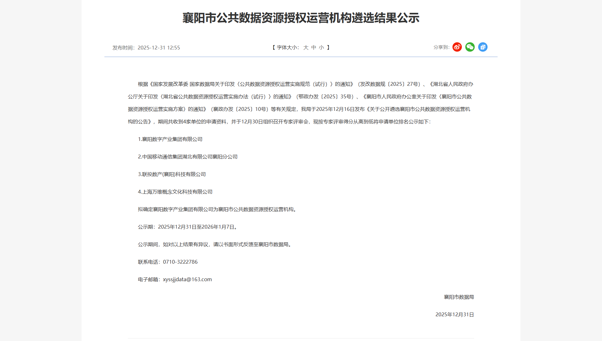 湖北日报讯(记者刘孝军、通讯员吕书琴、卓嘉)近日,襄阳市数据局发布公共数据资源授权运营机构遴选结果公示,汉江国有资本投资集团有限公司旗下襄阳数字产业集团有限公司(简称“数产集团”),成功入选拟授权运营机构。这是襄阳首次设立公共数据资源授权运营主体,标志着该市在数据要素市场化配置改革进程中迈出实质性步伐。